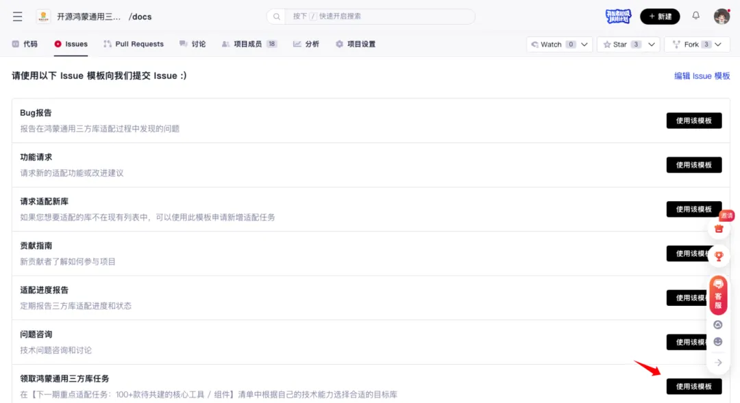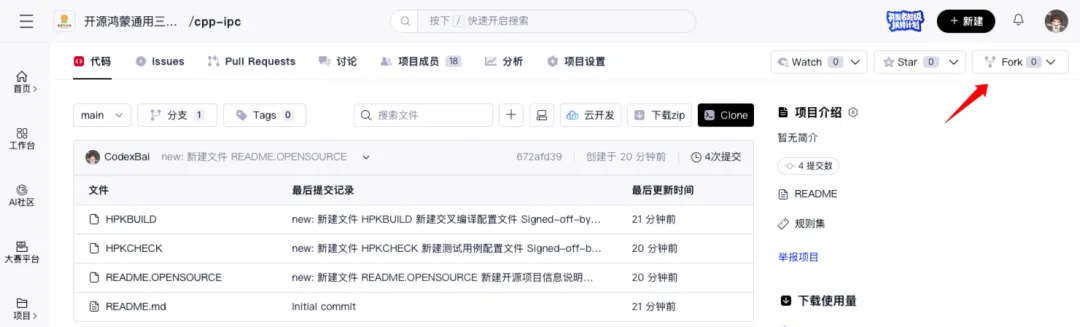 Fork仓库到个人账号点击评论区创建的目标适配仓库地址,在页面中点击Fork按钮。