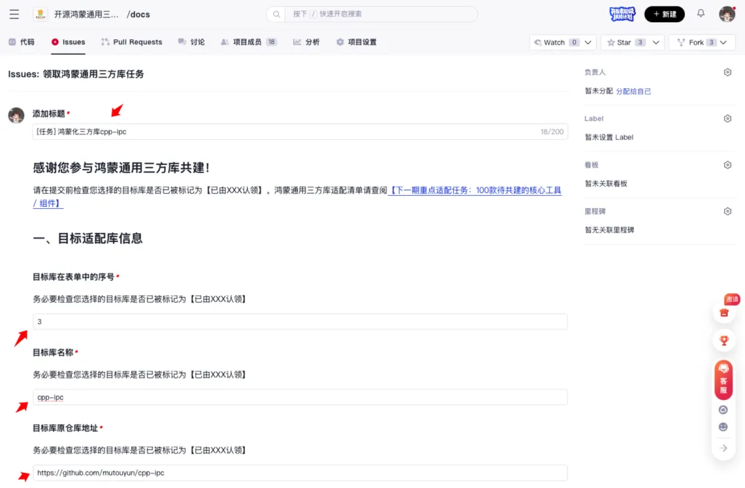 在开源鸿蒙通用三方库组织docs仓库[2]提交创建cpp-ipc仓库issue申请。