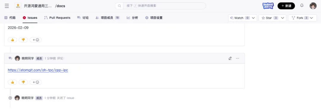 [1] `cpp-ipc`: https://github.com/mutouyun/cpp-ipc[2] 开源鸿蒙通用三方库组织docs仓库: https://atomgit.com/oh-tpc/docs[3] docs仓库: https://atomgit.com/oh-tpc/docs