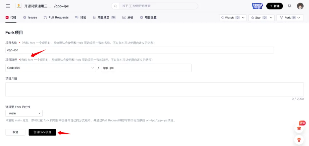 在Fork项目信息页面“项目路径”选项中选择“个人账号”,点击“创建Fork项目”按钮将目标仓库Fork到个人账号。