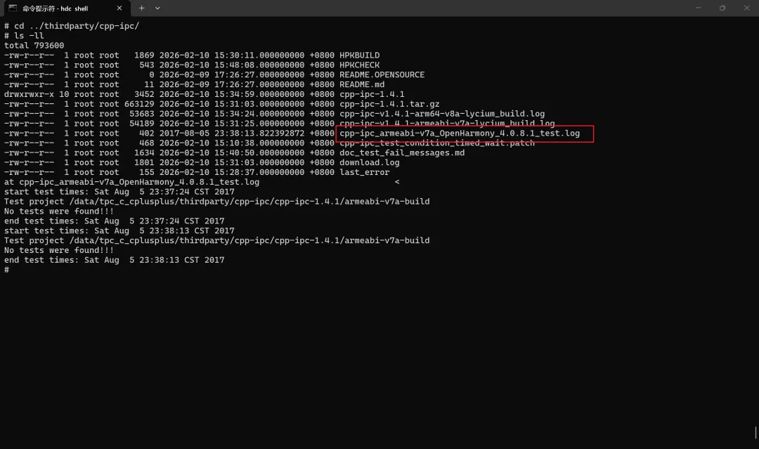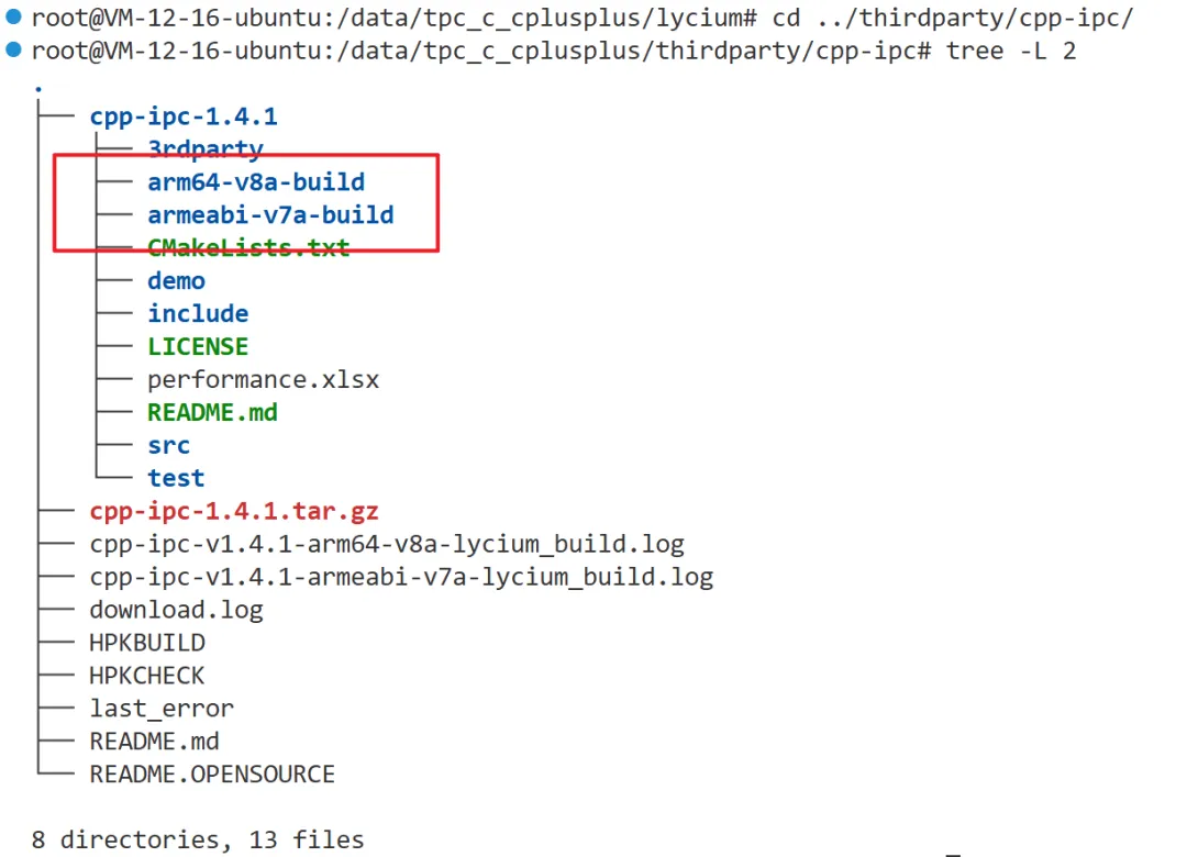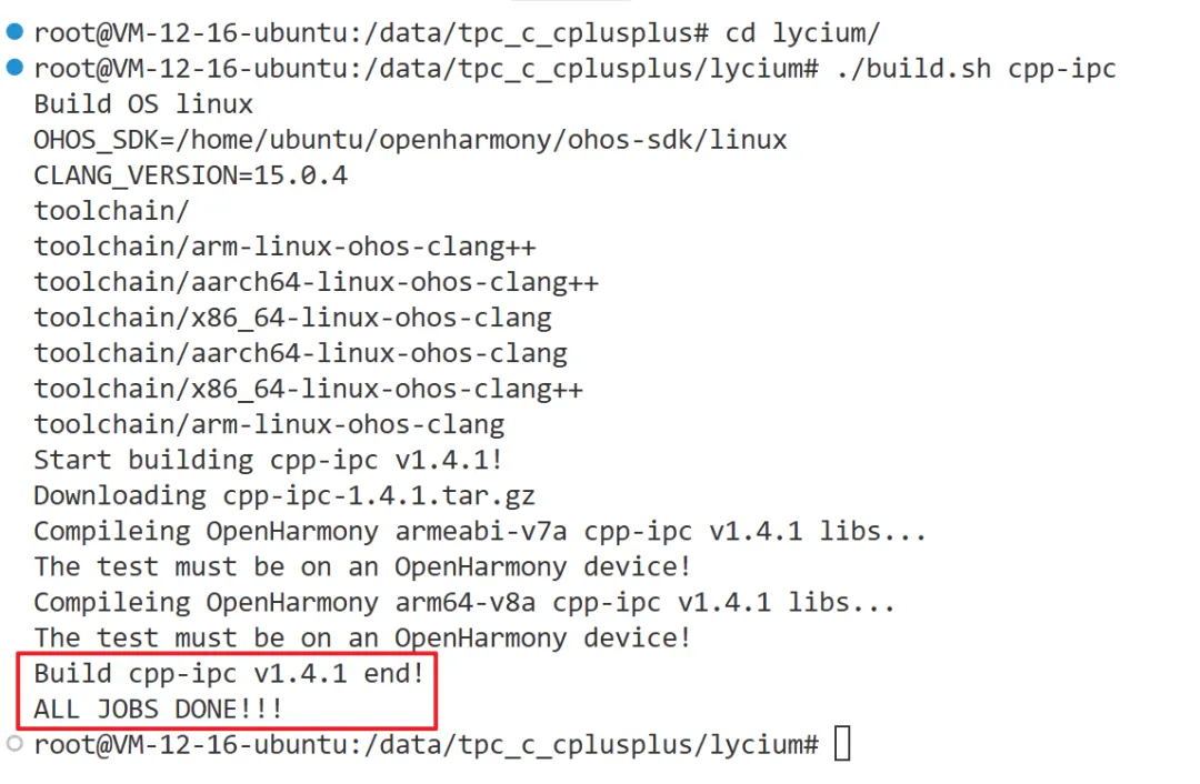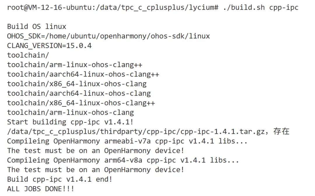 thirdparty/cpp-ipc/cpp-ipc-*、lycium/usr/cpp-ipc、lycium/usr/hpk_build.csv、lycium/lycium_build_intl.log),重新执行./build cpp-ipc命令。交叉编译完成后,将cpp-ipc打包(根据CPU架构选择)并推送到ohos设备/data/tpc_c_cplusplus/thirdparty/目录,删除当前目录下cpp-ipc文件,并解压推送的新文件。在tpc_c_cplusplus/lycium目录执行bash ./test.sh cpp-ipc命令运行测试用例。