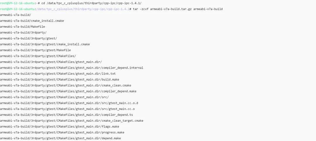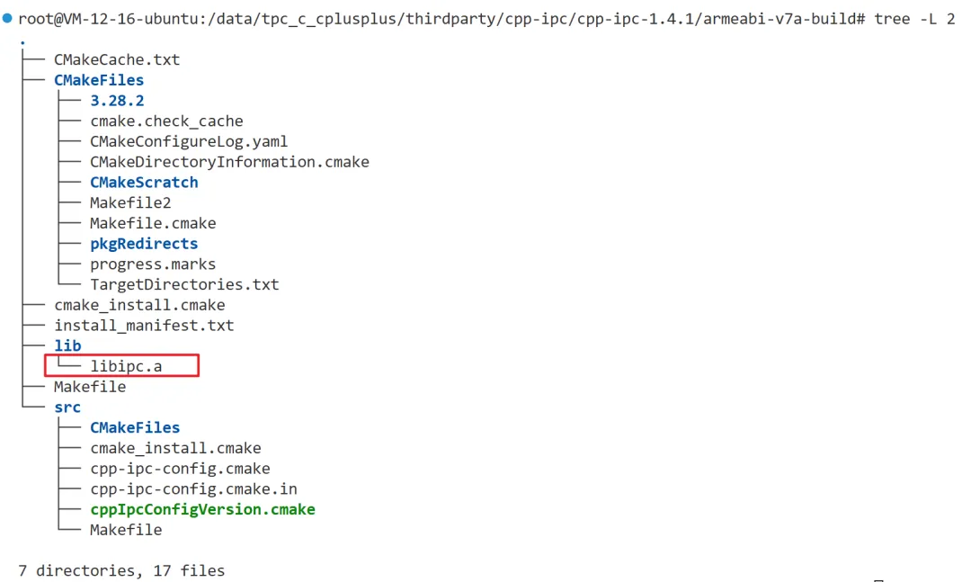 通过命令hdc shell getconf LONG_BIT查到ohos设备是32位,进入到armeabi-v7a-build目录,查看目录结构。由目录结构可以看出cpp-ipc最终交叉编译完成的产物是静态库。