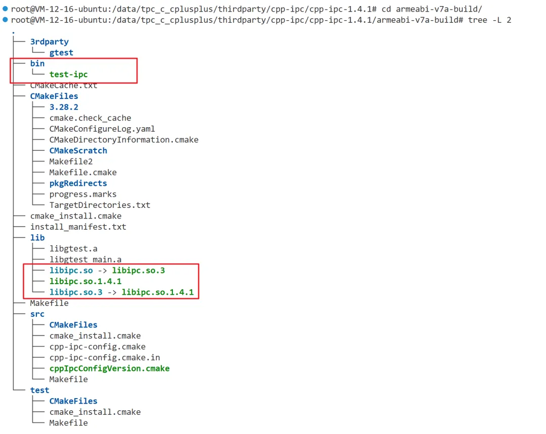查看cpp-ipc/cpp-ipc-1.4.1/armeabi-v7a-build目录结构,可以看到已经有了动态库文件和测试执行二进制文件。