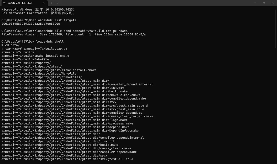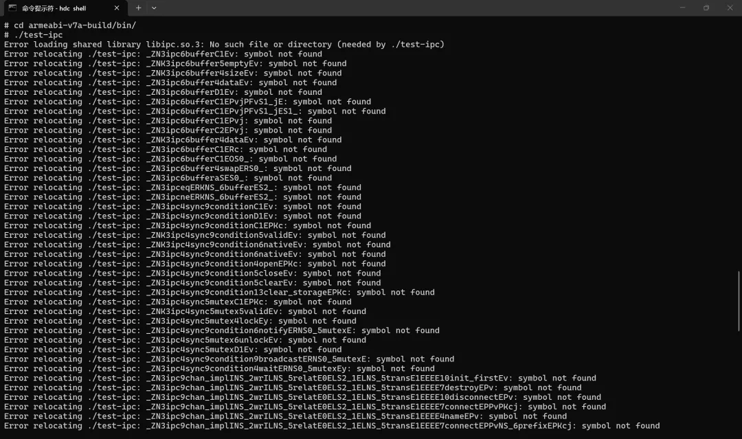ohos设备验证将cpp-ipc/cpp-ipc-1.4.1/armeabi-v7a-build压缩后使用hdc file send命令推送到ohos开发板上。