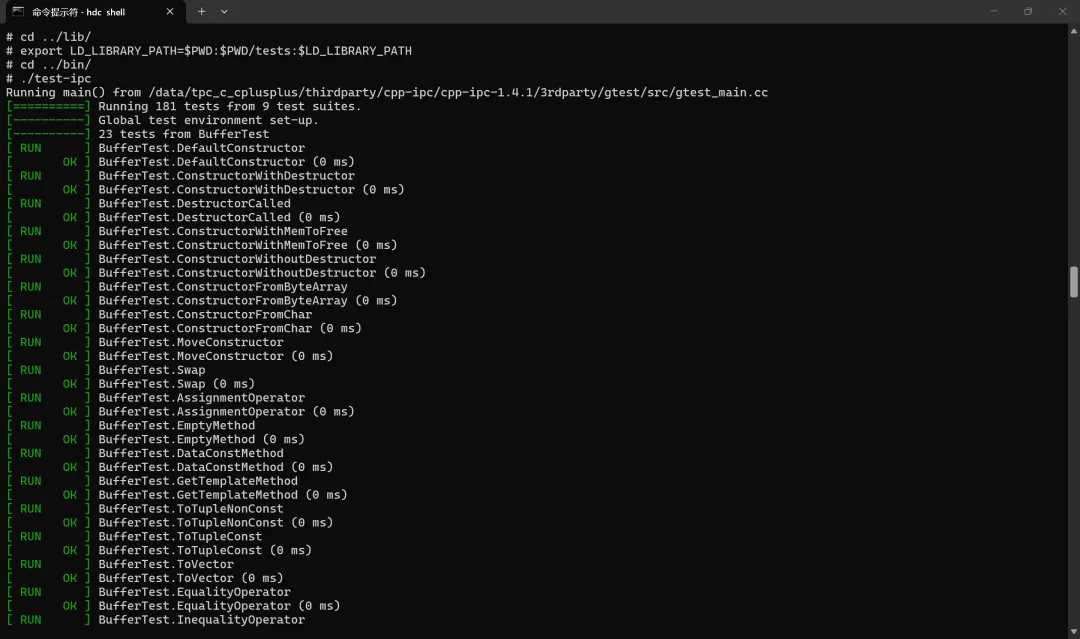 ./build cpp-ipc交叉编译命令,推送资源包到ohos设备上,再执行./test_ipc执行测试用例。