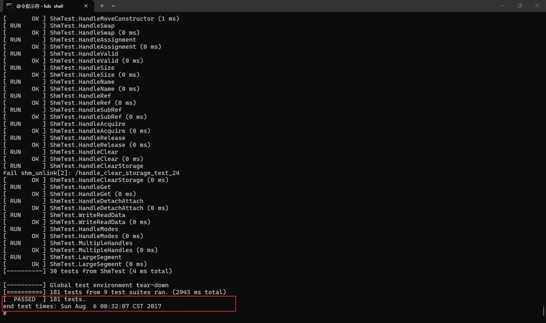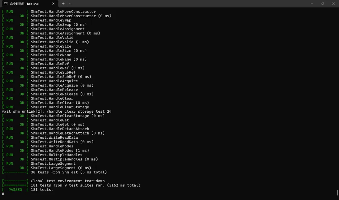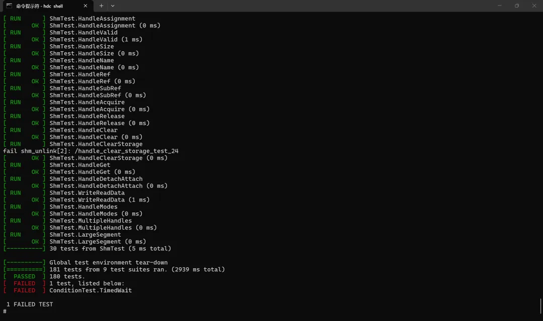 输出 含义 fail shm_unlink[2]: /xxx清理共享内存时 shm_unlink()失败,errno=2(ENOENT,对象不存在)。在OHOS等环境下较常见,清理时对象可能已被删或路径不同,测试会忽略并继续。fail: send, there is no receiver on this connection.用例 SendWithoutReceiver / SendTimeout故意在“无接收端”时发送,用来验证发送失败并被正确返回。fail release: invalid id (mem = 0, size = 256)用例 RemoveById / RemoveByName等在无效/已释放句柄上调用,用来验证错误处理。