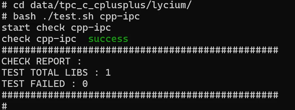 }清除交叉编译的产物(包括thirdparty/cpp-ipc/cpp-ipc-*、lycium/usr/cpp-ipc、lycium/usr/hpk_build.csv、lycium/lycium_build_intl.log),重新执行./build cpp-ipc命令。交叉编译完成后,将tpc_c_cplusplus打包并推送到ohos设备与交叉编译同路径下。在tpc_c_cplusplus/lycium目录执行bash ./test.sh cpp-ipc命令运行测试用例。