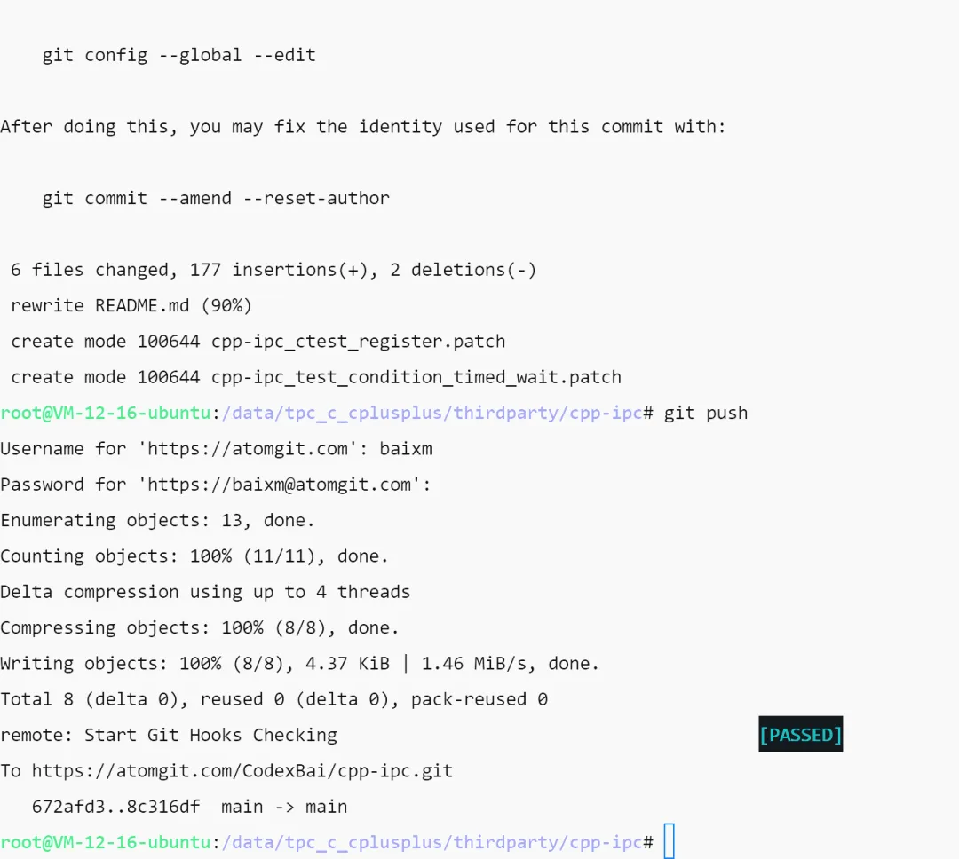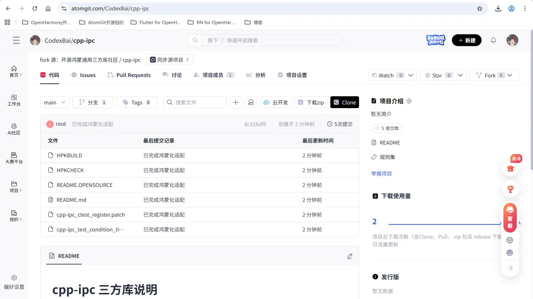 用浏览器访问fork后的仓库地址,也就是上图中To https://atomgit.com/CodexBai/cpp-ipc.git。查看各文件内容,确保提交无误。