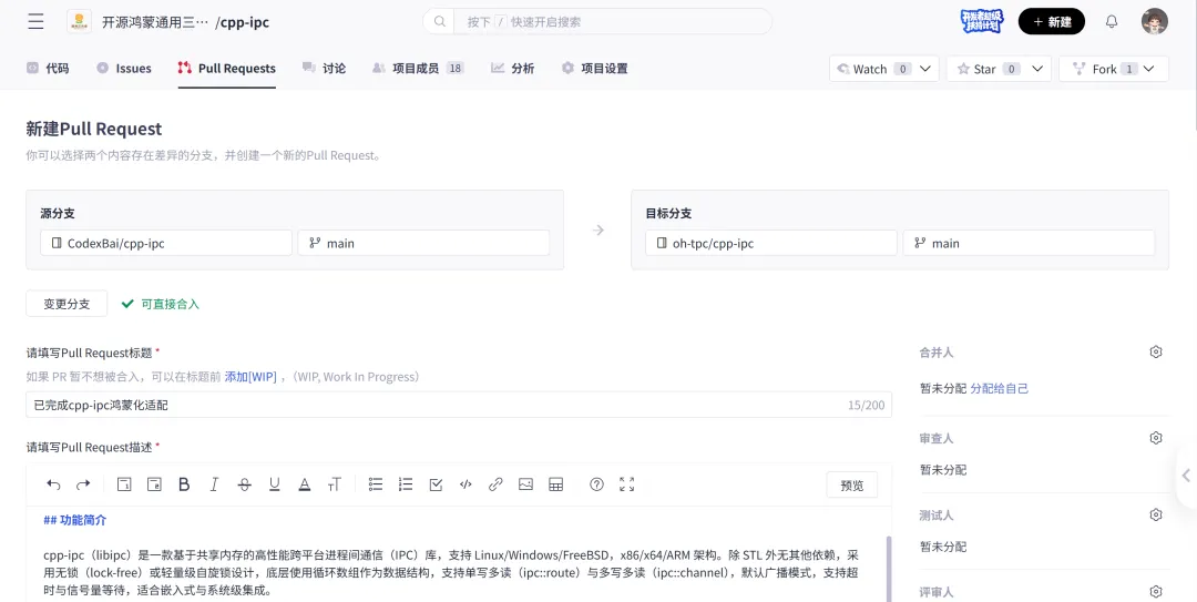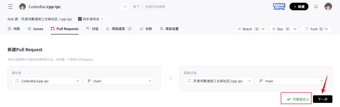 “新建Pull Request”界面中出现“可直接合入”,点击“下一步”进入PR信息填写页面。