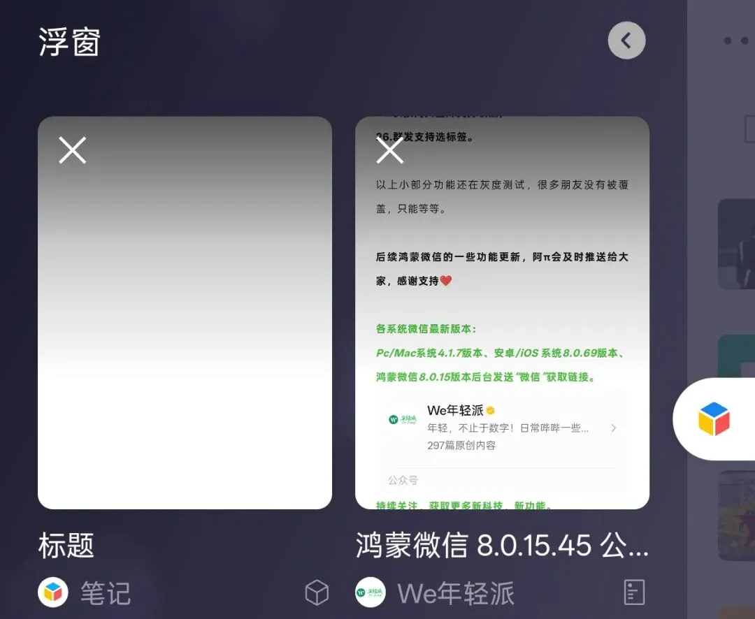 浮窗功能则是将笔记放入微信右侧边缘,点击就可以拉出笔记。
