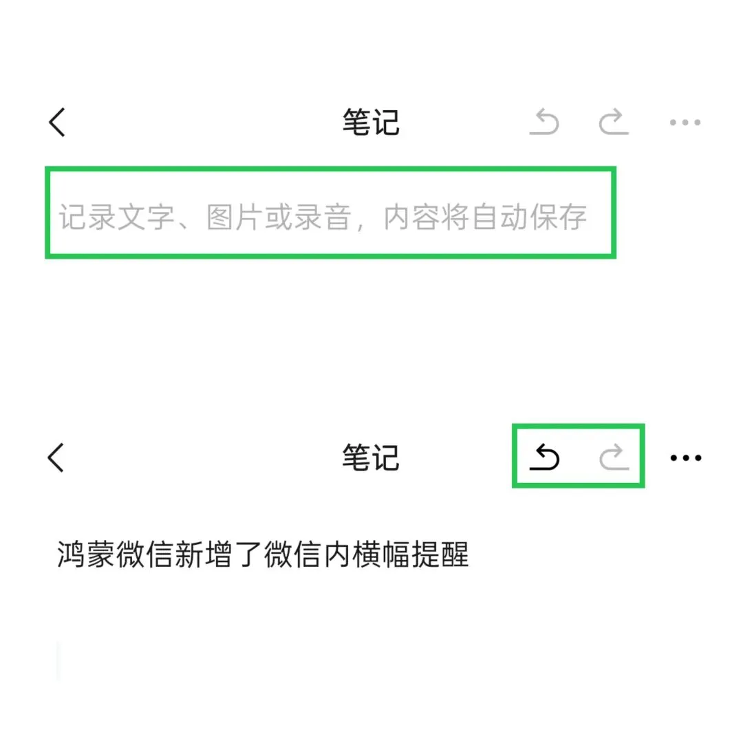 在笔记输入之前,增加提示语“记录文字、图片或录音,内容将自动保存”。在页面的右上角,新增撤回按钮。