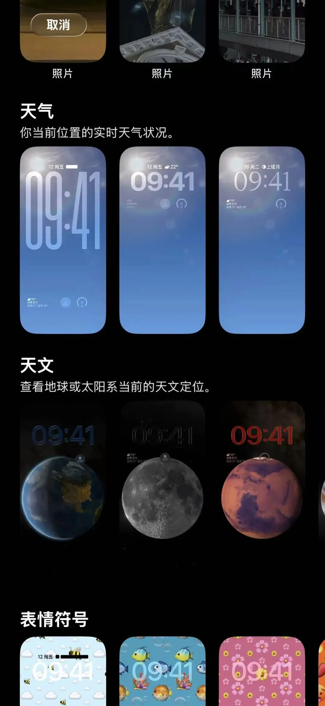 5、调整了锁屏壁纸界面,现在「天气」和「天文」壁纸被分割成两个板块。