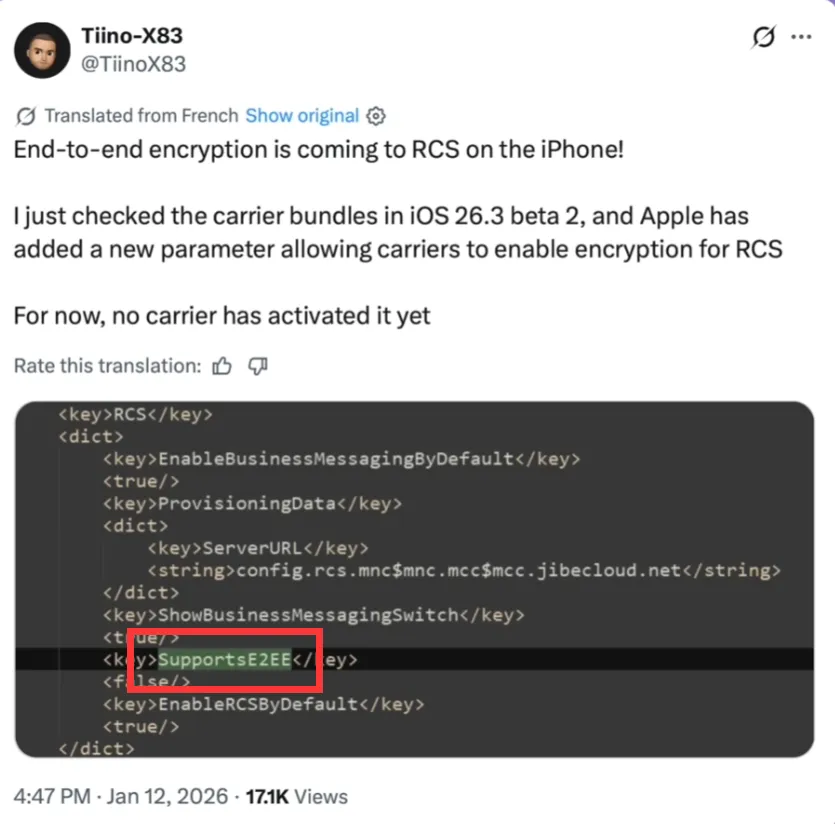 8、发现了 iPhone 可能即将支持收发端对端加密的 RCS 信息。