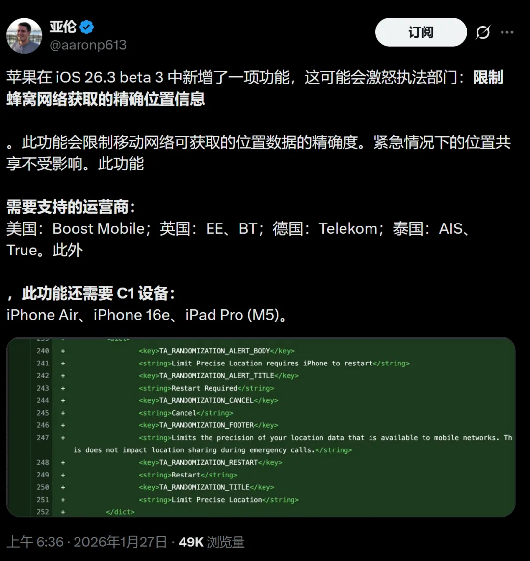 9、新增了部分 iPhone 可限制运营商通过蜂窝网络获取精确位置信息。