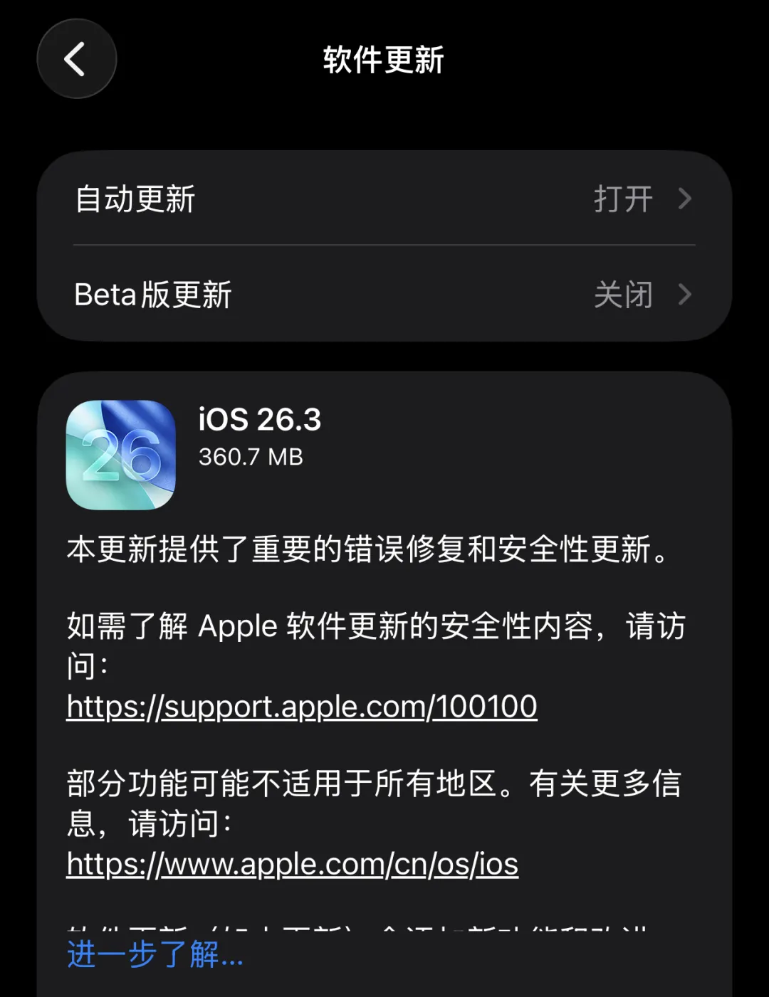 如果你已经升级了 iOS 26 系统的话,那么还是建议继续更新到 iOS 26.3 正式版的。