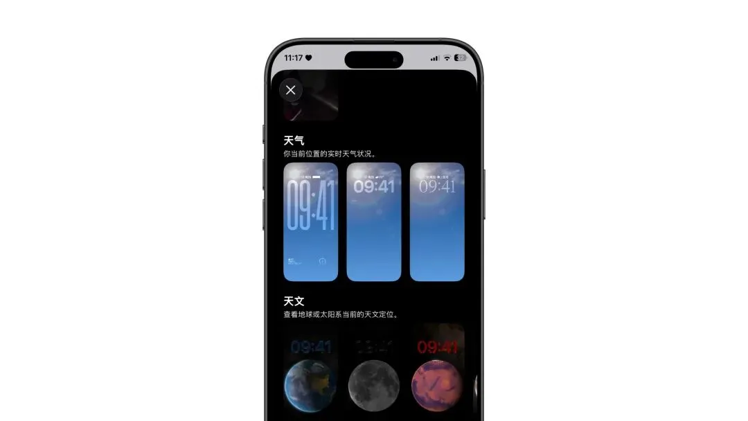 在锁屏壁纸部分,“天气”与“天文”现已拥有独立分类入口,其中“天气”壁纸新增三种预设布局。