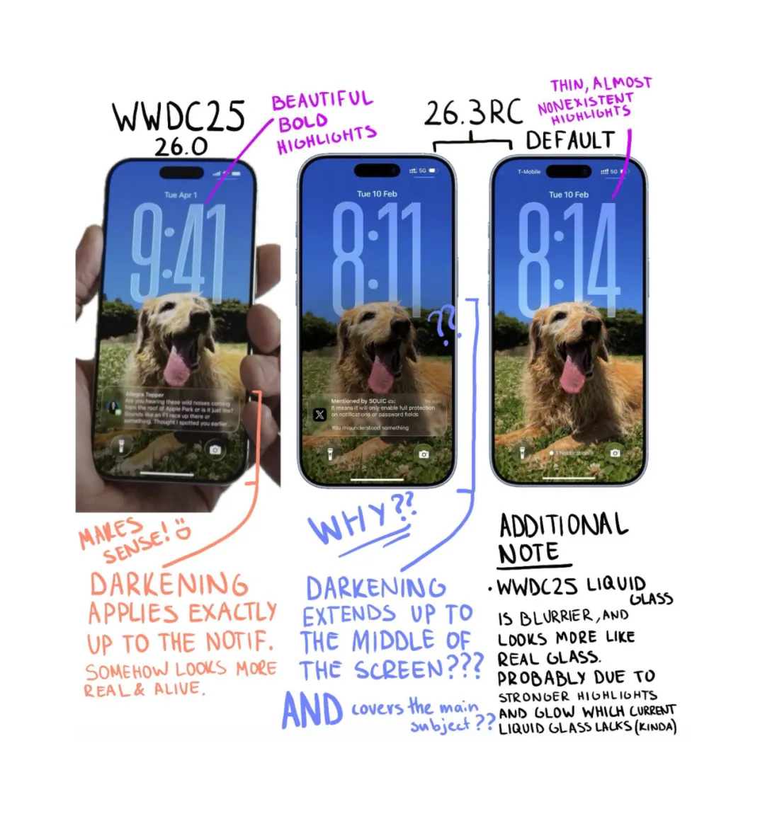然而,当 iOS 26 正式版(从 26.0 到当前的 26.3 RC)后,许多人发现实际体验与 WWDC 预览存在明显落差。知名 iOS 设计观察者 @OutofGalaxyy直接开骂了:我重看WWDC2025,发现苹果没有完全兑现承诺,锁屏部分尤其令人失望。it looks ugly.