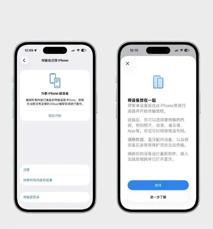 这一次最大的亮点是支持与安卓换机传输,可通过无线传输照片、短信、备忘录、应用等数据。主打一个方便,这下换机更加方便,这个确实方便了许多,安卓与iPhone之间的相互切换更加细滑,现在大多数有的用户就是双持,安卓那边也是支持苹果生态,也是很不错。你打算换安卓吗?