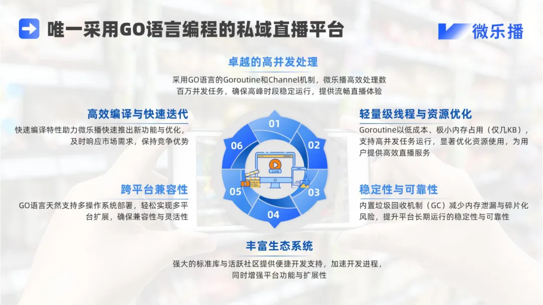 浙江微乐播信息科技有限公司初创于2012年,是专注微信生态的企业级直播SAAS服务提供商。微乐播是唯一采用GO语言编程开发的私域直播平台,具备毫秒级低延迟、百万级高并发、高安全性的直播技术保障。