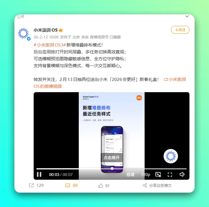 小米澎湃 OS 官方微博今日正式宣布,澎湃 OS3 新增堆叠排布模式,并公布了新特性的演示视频。