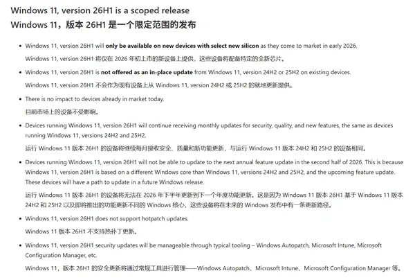 微软明确 Win11 26H1 核心信息