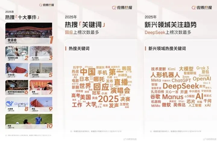 微博热搜发布了 2025 微博热搜趋势报告完整版。报告显示,全运会、电影哪吒出圈、AI 浪潮、高考均有登上十大事件;而热搜关键词排名中,回应上榜次数最多,同时雷军、哪吒、演唱会、小米、手机等内容也在内。
