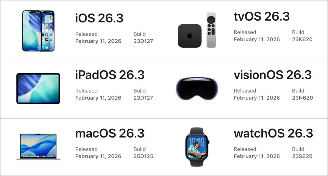 苹果在今天(2 月 12 日)凌晨推送了 iOS 26.3 正式版,同时发布的还有 iPadOS、macOS、watchOS 等系统的 26.3 正式版本。
