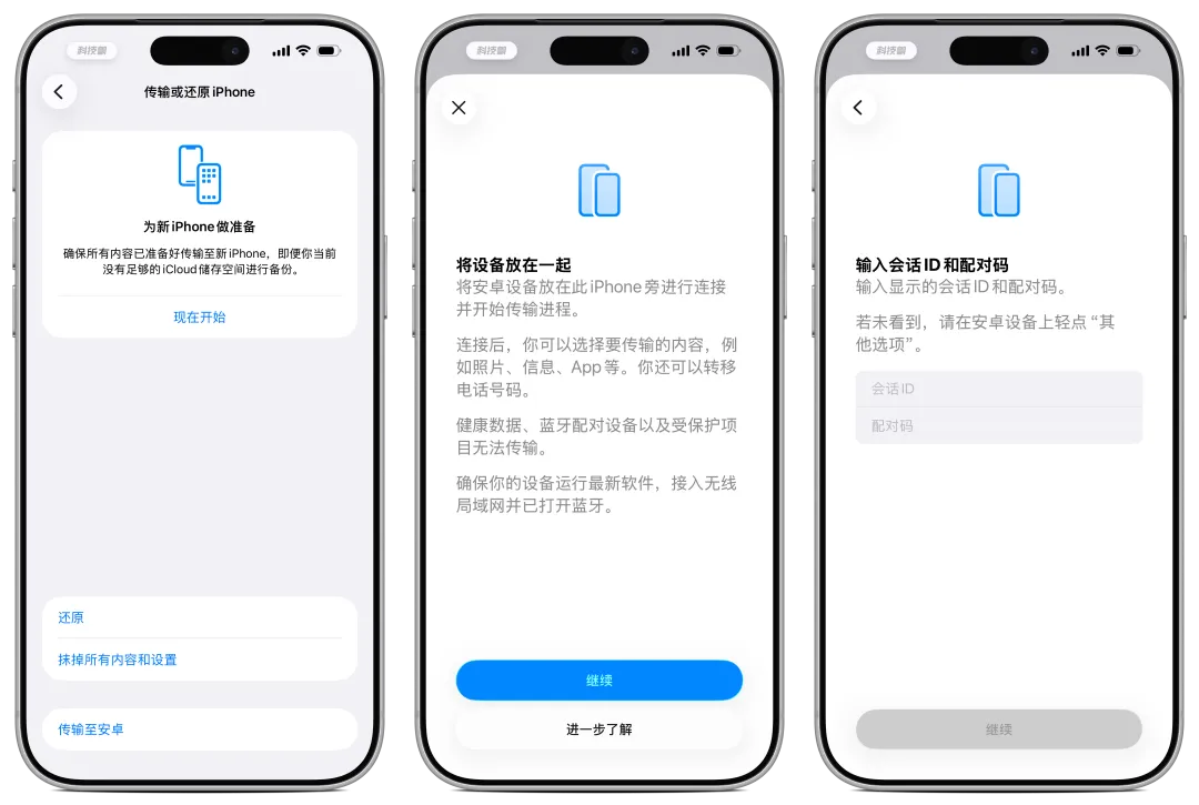 在「传输或还原 iPhone」页面底部,新增了「传输到安卓」入口。相比以往依赖第三方应用的方式,这次是系统级支持,迁移内容更完整,包括信息 App 中的短信数据、eSIM 等。