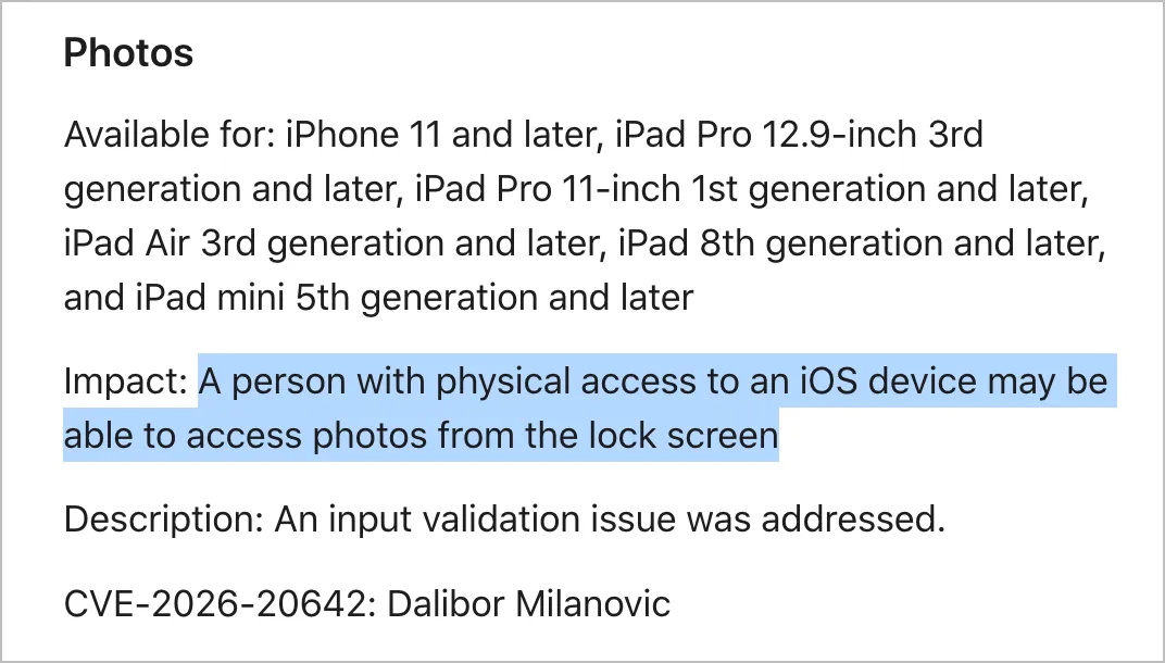 其中包括一个涉及照片应用的漏洞:物理接触到 iOS 设备的人,可能通过锁屏访问照片内容。该问题已在本版本中修复,属于相对严重的安全隐患。