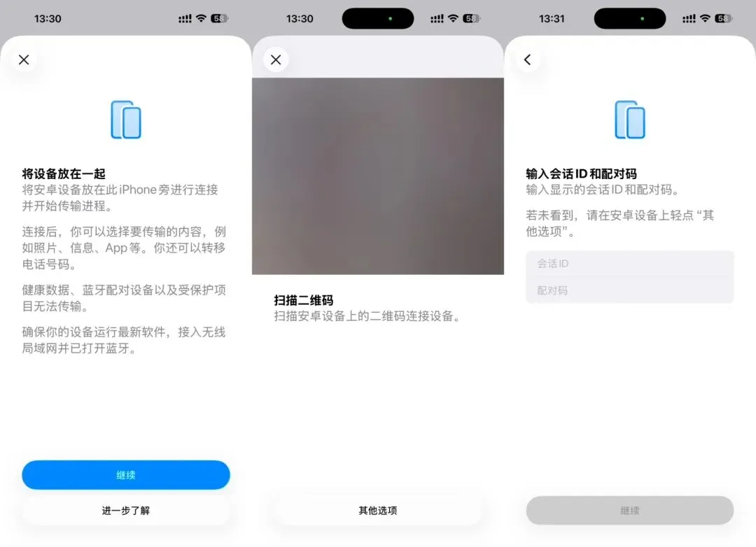 「传输或还原iPhone」新增入口,原生支持短信、eSIM等数据迁移,扫码/配对码连接,安卓端需适配。