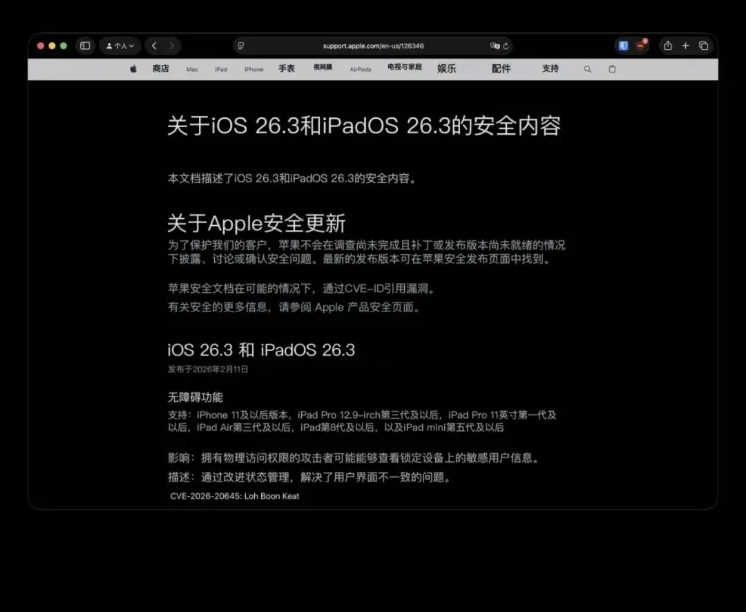 苹果今日凌晨推送iOS 26.3正式版(内部版本号23D127),同步更新iPadOS/macOS/watchOS 26.3;老机型专属推送iOS/iPadOS 18.7.5修复问题。本次更新以安全修复、稳定性优化为主,新增功能有限,部分功能受地区/运营商限制。
