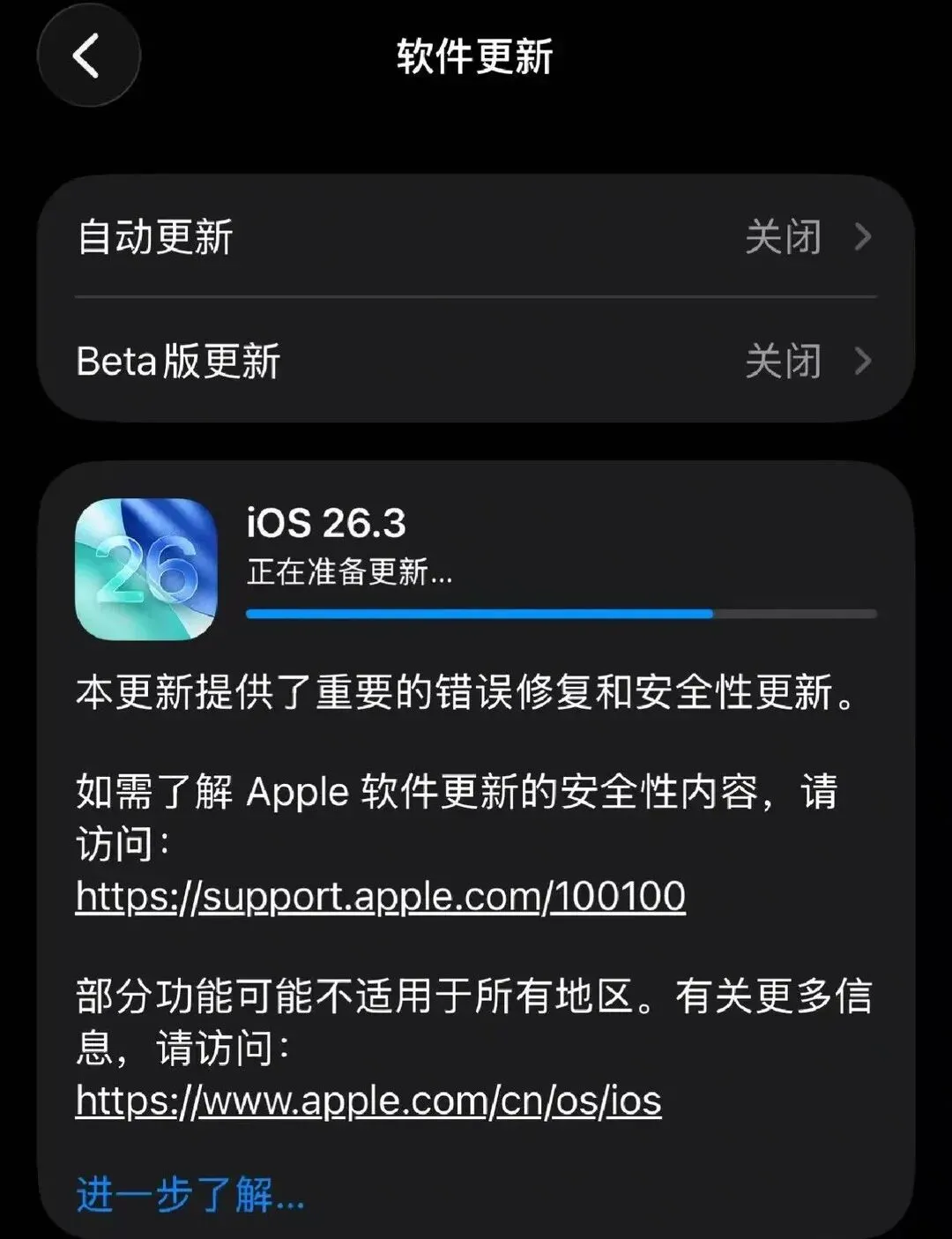 第二件事情是修补漏洞:锁屏信息泄露和WebKit漏洞(CVE - 2026 - 20608)都被修复了,降低了被恶意网页导致崩溃或者近距离泄露信息的风险。结论很简单:XS、XR的用户不要犹豫,升级是正确的选择,不升级会吃亏。