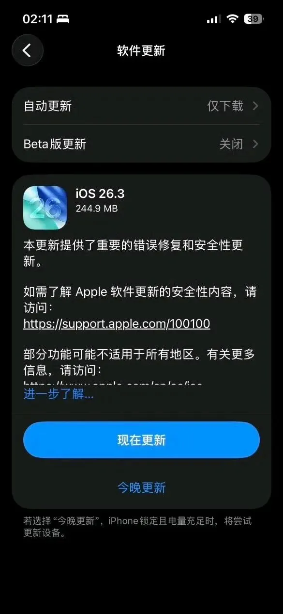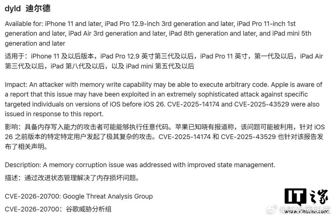 苹果发布了最新的安全白皮书。iOS 26.3修复了37项安全漏洞。其中存在一个高危内核漏洞(dyld),黑客积极地利用这个漏洞。这个漏洞有可能让攻击者获取系统的最高权限,并且还能够执行恶意代码。另外针对旧款机型iPhone XS/XR系列,苹果推送了iOS 18.7.5。主要是为了延长iMessage和FaceTime的证书有效期,从而使得这些老设备在2027年之后还可以正常地进行联网。
