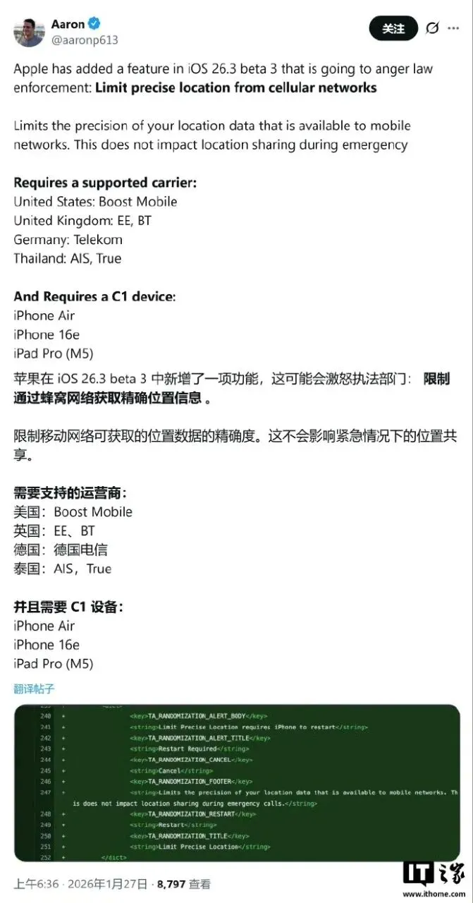 对于很多搭载苹果自主研发的 C1/C1X 调制解调器的机型,例如 iPhone 16e、iPhone Air 相关的情况。iOS 26.3 添加了“限制精确位置”的开关。在打开这个开关之后,运营商所能够获取到的定位精度就会从具体的街道地址转变为所在的大致街区。这也就意味着在确保基本信号服务的同时,用户的物理踪迹获得了更高程度的保护。但是这个功能当下还受到运营商适配方面的限制,国内的用户还需要等待进一步的普及。
