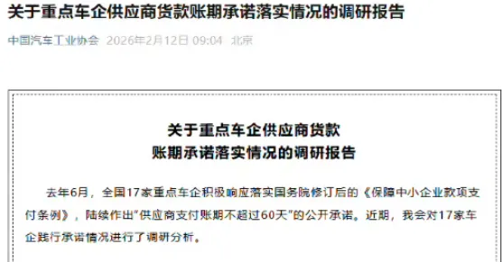 (新浪科技)今日,中国汽车工业协会发布关于重点车企供应商货款账期承诺落实情况的调研报告。