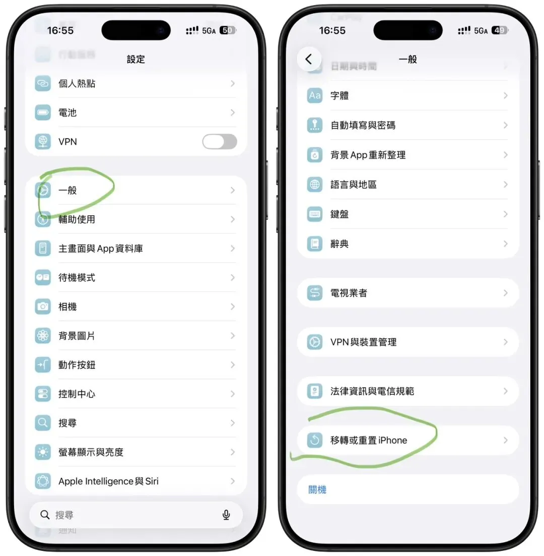 打开设定 APP,选择一般,然后划到最下面选择转移或重置 iPhone,如下图。