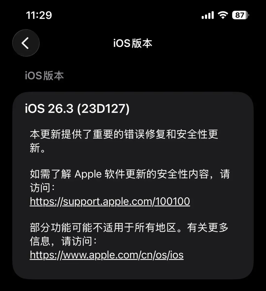 聊点实在、靠谱、不掺水的——苹果已经正式推送iOS26.3正式版(内部版本号23D127),距离上一版iOS26.2.1仅间隔16天。如果你正停留在26.2.1,这篇全是实测与官方信息,不吹不黑,告诉你该不该升级。