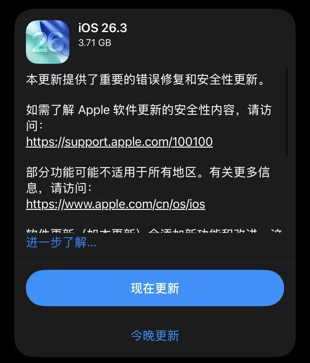先把核心说清楚:这一版不是堆功能的大更新,官方定位就是错误修复+安全性加固,刚好对准了26.2.1里那些让人闹心的小问题。可以说,它更像给iOS26全系列做了一次兜底优化,对26.2.1用户尤其友好。