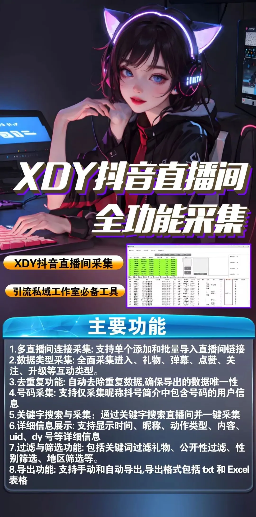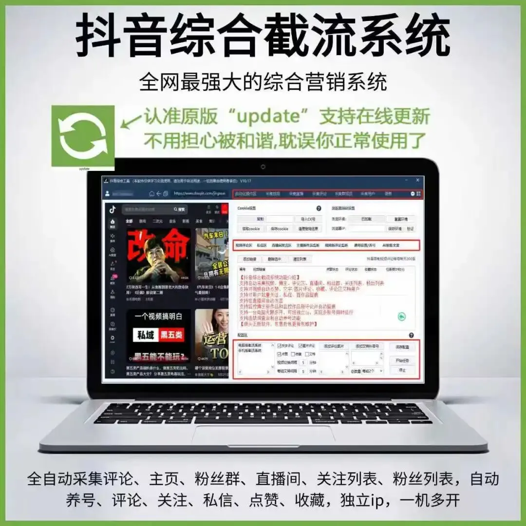 全自动采集评论、直播间、自动养号、一键全自动私信、一键全自动关注、一键全自动评论、一键全自动点赞、一键全自动收藏、自动回复评论、独立IP 、一机多开、持续自动更新。