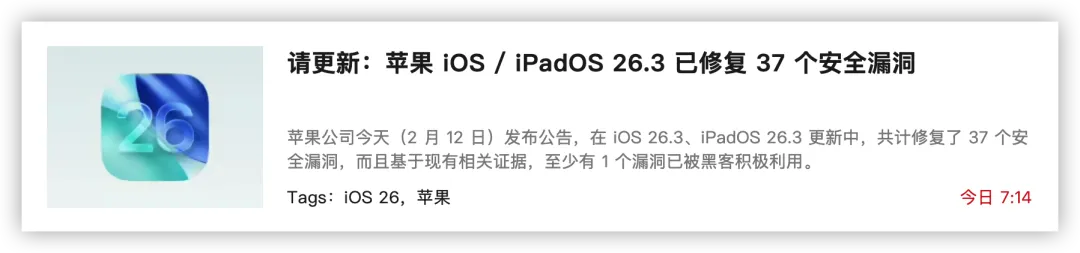 作为一个大版本更新,苹果在 iOS 26.3 中修复了海量的系统漏洞。本次修复的漏洞共 37 个,且基于相关证据,其中至少有一个漏洞已被黑客积极利用。出于安全性考虑,建议已升级 iOS 26 的用户,尽快更新至最新正式版系统。