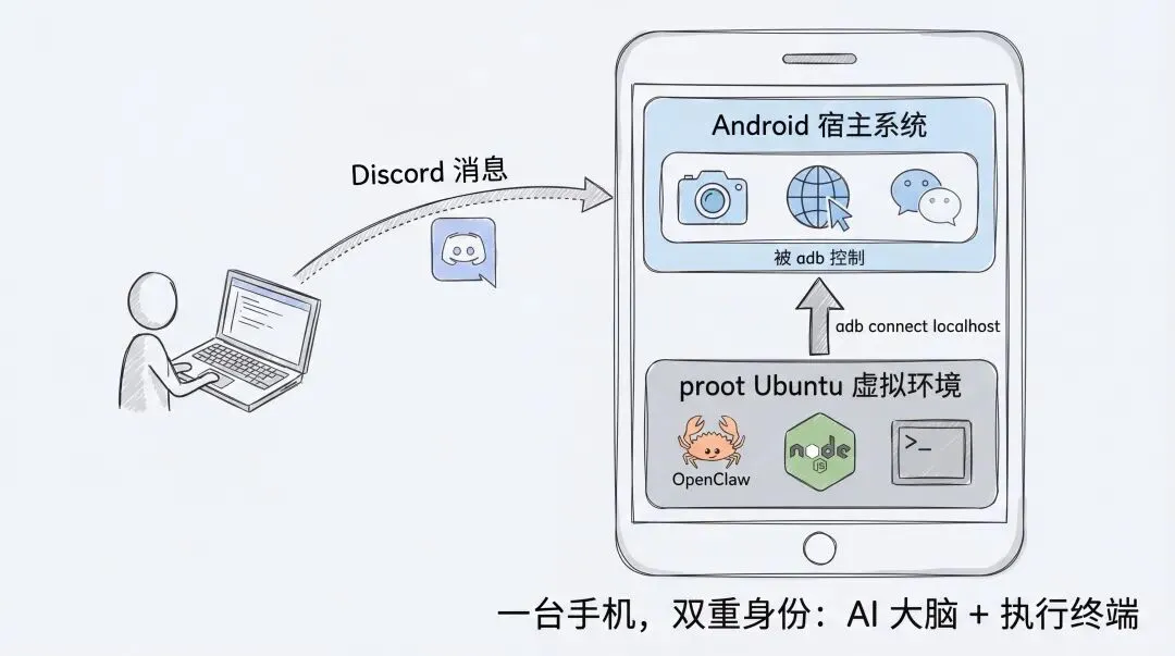 一台手机,双重身份:既是运行 AI 的服务器,又是被 AI 控制的设备。在虚拟 Linux 环境中运行 OpenClaw,通过 Discord 对话让它控制手机本身——现在就能实现。