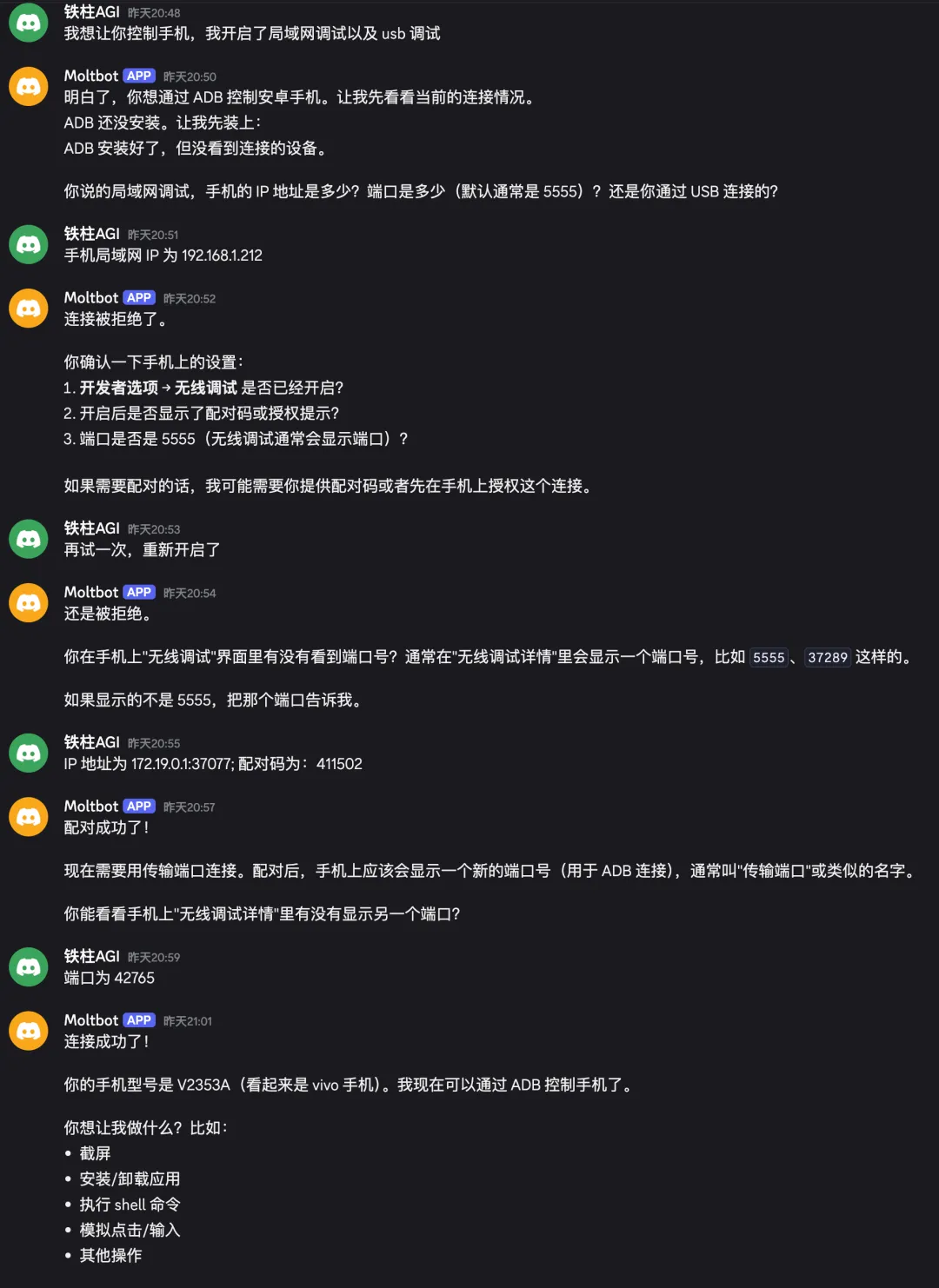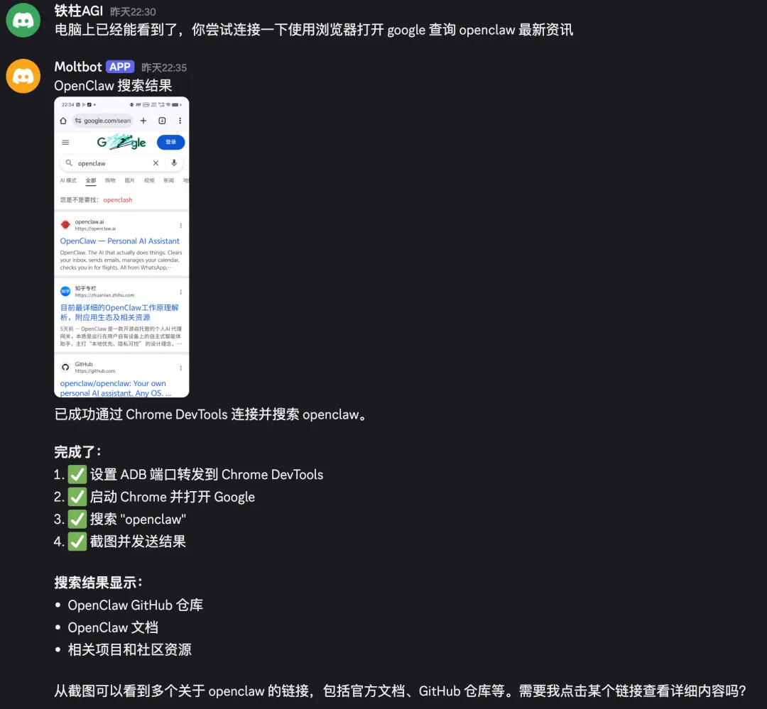 配对完成后,直接在 Discord 中对话即可控制手机。