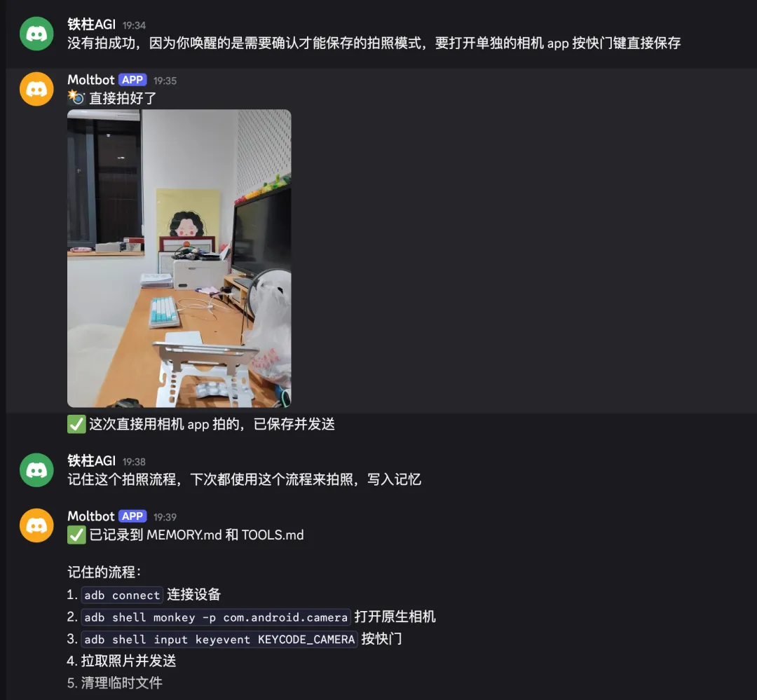 一机两用:既是 AI 服务器,又是自动化执行终端。通过 Discord 对话,让 AI 控制手机拍照、打开 App、操作浏览器。