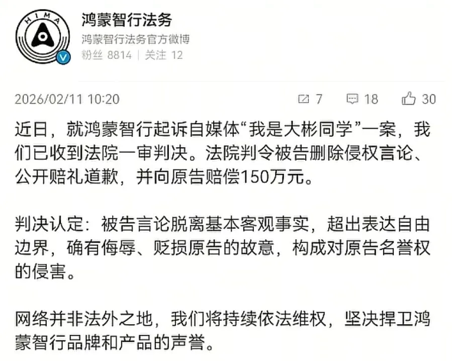 2月11,鸿蒙智行起诉自媒体“我是大彬同学”案一审宣判。法院认为“我是大彬同学”长期在各大媒体平台发布诋毁、造谣抹黑言论,有故意侮辱贬损之意,构成侵权。判决“我是大彬同学”删除侵权内容、公开道歉并赔偿150万元。目前还不知其会不会选择上诉。