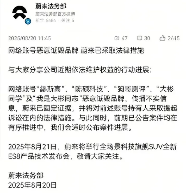 有意思的是“我是大彬同学”不仅被鸿蒙智行起诉过,还被蔚来汽车起诉过。目前蔚来方面已经固定证据提起诉讼,此案尚未宣判,但已经被蔚来列为重点打击网络水军之一。