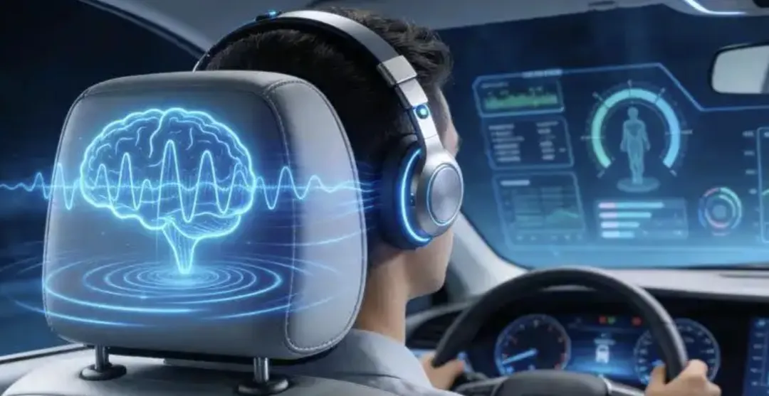 本方案,将脑机接口设备的头带和电极组件与头枕整合为一个整体,既能够对异常状态进行检测,还能够输出电流缓解异常状态,丰富了汽车健康监控功能。