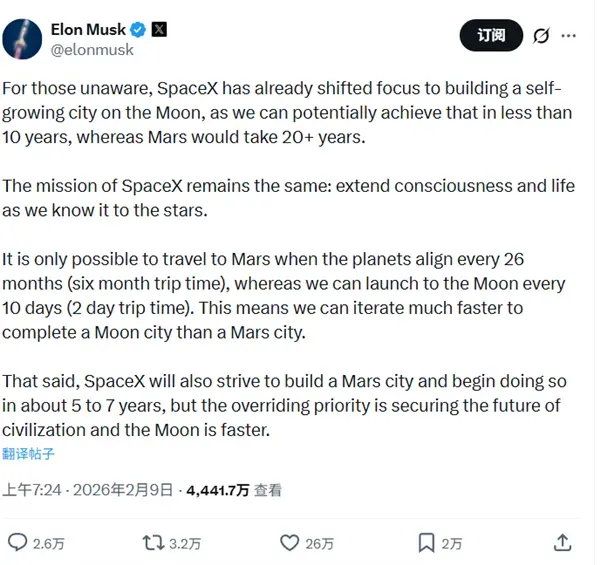 马斯克自2002年创立SpaceX以来,一直强调人类多星球生存目标,过去以火星为核心方向。但近几个月,他频繁提及月球,将其视为迈向火星的跳板。两名前SpaceX高管表示,月球此前并非公司核心战略重点。马斯克表示,公司将先在月球建立“一座自给自足的城市”,随后前往火星,最终探索恒星系统寻找外星生命。