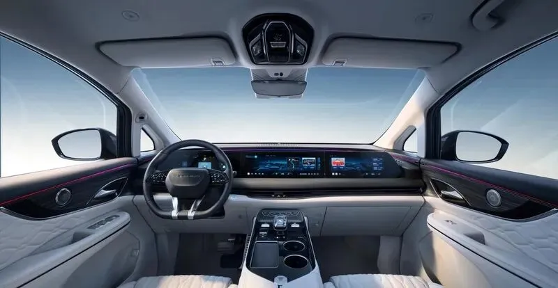 坐进车里才是真叫人眼前一亮,这内饰把“豪华”俩字儿拆开了揉碎了往里头塞。配色用了绒霞紫,不是那种扎眼的艳,是带点柔光的紫,跟家里高档沙发的绒布料子似的,瞅着就暖乎。天然实木饰板往上一铺,摸上去有自然的纹理,不像塑料仿的那么假,高级感一下就出来了。最抓眼的是一体式贯穿屏,从主驾一直铺到副驾,跟把大平板嵌车里似的,导航、音乐、车辆设置啥的一目了然,开车时瞟一眼就能找着要的信息,不用低头瞎划拉。还有水晶旋钮,转起来咔嗒响,清脆又有质感,调空调温度或者切换模式,手感比普通塑料按键强太多。座椅是NAPPA真皮包的,软硬度刚好,坐久了不硌腰,透气性据说也不错,夏天穿短裤坐上去不会闷得慌。音响是华为sound的,咱都知道华为在声学上没少下功夫,高低音层次分明,放首歌跟小剧场似的,堵车时听听歌,烦躁劲儿都能散不少。
