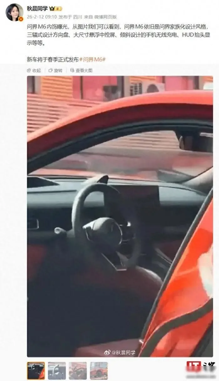 2月11号那天,博主“秋晨同学”在社交平台发布了几张问界M6的内饰谍照,图片有点模糊,颜色也不太确定,不过还是能看出三幅式方向盘、悬浮式中控屏、倾斜设计的无线充电面板、HUD抬头显示以及怀挡布局,这些设计不是随意拼凑的,它们之间有功能上的配合:比如无线充电面板的角度让手机放上去稳稳当当,手一伸就能操作屏幕,怀挡的设计也给中控台腾出了空间,方便以后加入语音控制或手势交互这类功能。