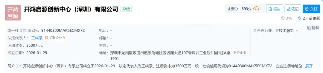 最新资讯,开源鸿蒙生态的核心共建单位[深开鸿]已于1月29日成立子公司[开鸿启源创新中心(深圳)有限公司], "鸿蒙之父"、深开鸿CEO王成录担任法人,股东名单中除了同为开源鸿蒙核心共建单位的[中软国际]以及深圳地方国企外,深圳人形机器人创企[数字华夏]奕位列股东名单。